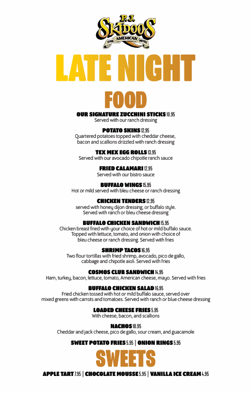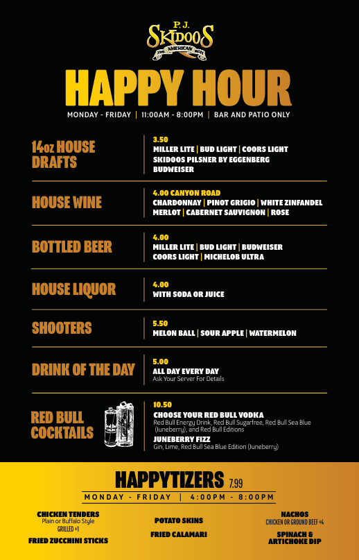 PJ Skidoos is the perfect place to hang out with your friends after work, to celebrate a special occasion, or to root for your favorite team on game day. You can reserve bar space for 2 to 75+ people. We have great Happy Hour food and drink specials, a diverse beer menu and fun frozen drinks so you will have no problem something delicious to kick back and relax with PJ Skidoos. Join us in the warmer months on our outdoor patio, featuring dining tables, a full bar and TVs!
