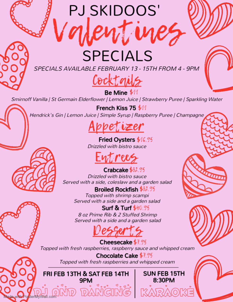 Dinner specials available for dine in or to go February 13-15th.